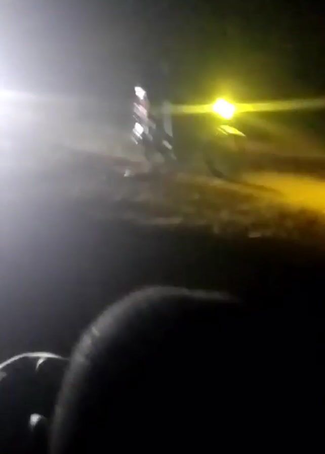 At night, an individual in light-colored clothing stands beside a parked motorcycle, illuminated by the motorcycle's bright headlight, on a dimly lit, rough, unpaved surface. The camera appears to be positioned from inside a vehicle, with a dark, blurry object filling much of the foreground.