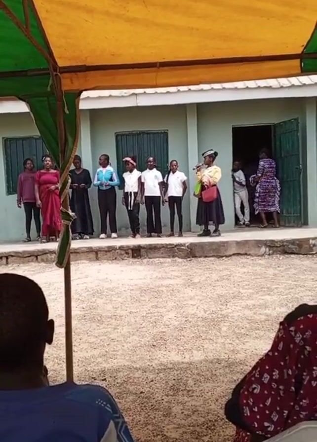 From a seated perspective under a green-and-yellow canopy, the video shows a group of nine people of varying ages and skin tones standing on a concrete platform in front of a pale green building with dark green barred windows and a doorway. The people are dressed in formal and casual attire. The building sits on a gravel ground, and people are milling about near the entrance. One woman in a yellow jacket and dark hat speaks into a microphone while holding a brown bag. The scene appears to be an outdoor event or ceremony.