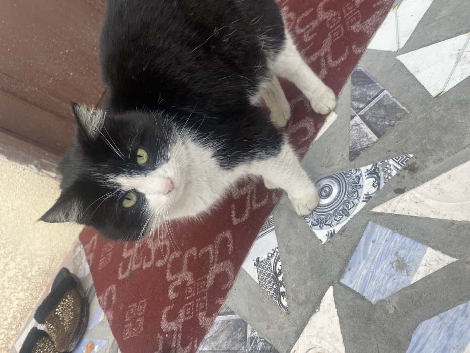 black and white domestic cat standing on a multi-textured floor surface in Akhtachi, Uzbekistan
