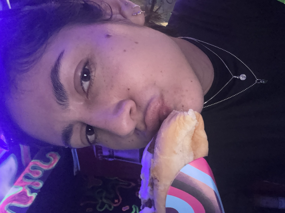 A close-up shot of a person holding a hotdog. The person has fair skin, dark hair, and freckles. They are wearing a black shirt and a silver necklace. The hotdog is wrapped in a colorful paper holder with pink and blue stripes. The background is dark with neon lights. The person is looking at the camera with a slightly pouty expression.