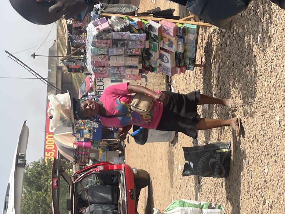 An outdoor market scene in Nyanya, Nigeria, is depicted under bright sunlight