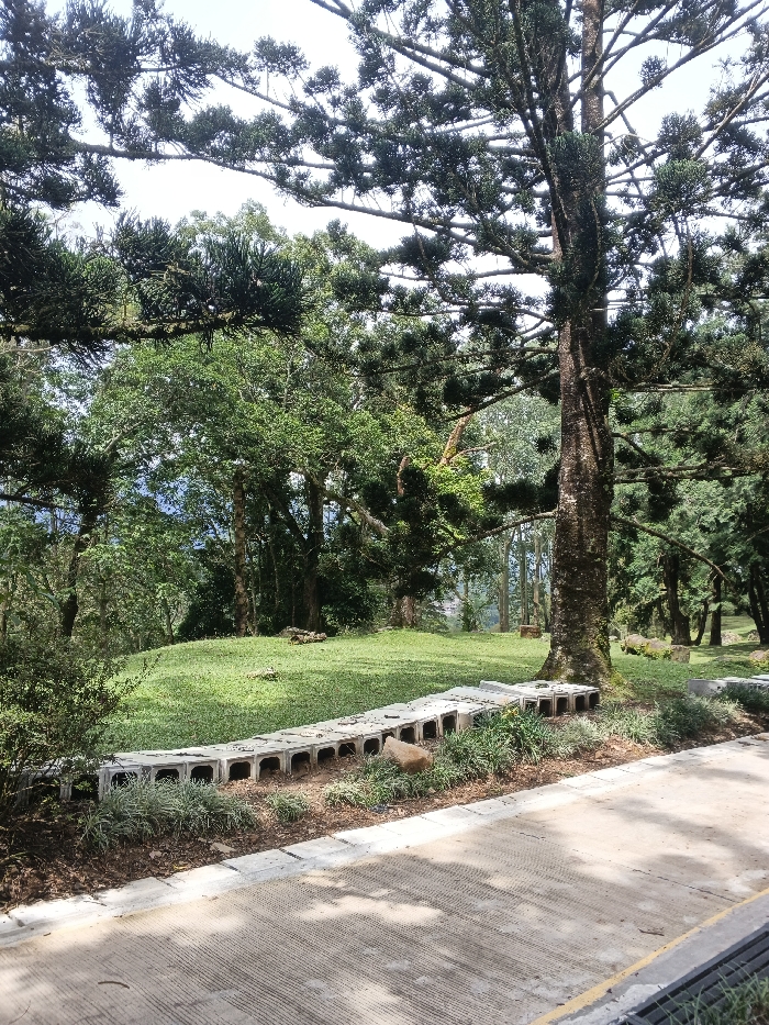 The image captures an outdoor, landscaped scene in Kwekwe, Zimbabwe, under bright daylight conditions. A light-colored concrete pathway, featuring textured surface lines, occupies the lower right quadrant of the frame. To the left of this pathway, a low, curved border is constructed from approximately fifteen modular, light-grey concrete blocks, each perforated with multiple rectangular apertures. These blocks are arranged horizontally on a strip of dark earth, mixed with light-brown organic material and sparse green vegetation. A small, light-brown animal is positioned on this organic material near the concrete blocks. Immediately behind this border, a manicured, vibrant green lawn extends, sloping gently upwards. The background is densely populated with mature trees, including several tall evergreen trees with dark, needle-like foliage and visible, textured trunks dominating the mid-right and upper portions of the image. Further back, a mix of deciduous and evergreen trees forms a dense canopy. The sky is bright and partially visible through the upper tree branches. No human subjects are present in the scene.