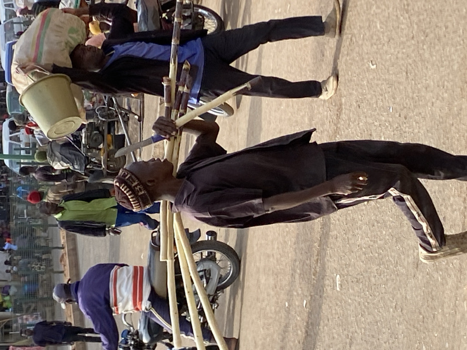 The image depicts a bustling outdoor scene in Bukuru, Nigeria, likely a market street. In the foreground, an adult male with dark skin is walking from left to right, his head turned slightly to his right. He wears a dark brown short-sleeved collared shirt, dark pants with a light stripe on the outer seam, and light-colored shoes. A brown knitted cap with lighter patterns covers his head. He carries several long, light-colored stalks, identifiable as sugarcane, horizontally across his left shoulder. A long knife or machete with a blue handle rests on these stalks, held by his right hand. To his right, another adult male, also with dark skin, walks from right to left. He wears a dark jacket over a blue shirt, dark pants, and light-colored shoes. He carries a light green bucket and a large, striped fabric sack on his head. His right arm is slightly raised, appearing to steady the load. In the mid-ground to the left, a third adult male, with his back partially to the viewer, sits on a dark motorcycle. He wears a purple jacket with white and red horizontal stripes and dark pants. The motorcycle has several long, light-colored stalks, similar to those carried by the foreground figure, laid across its rear seat. The ground is unpaved, appearing dusty and light brown. In the background, numerous other individuals are visible walking or standing. Several light-colored vehicles, including vans or cars, are present, along with a green metal fence or railing structure. The scene is illuminated by bright daylight.