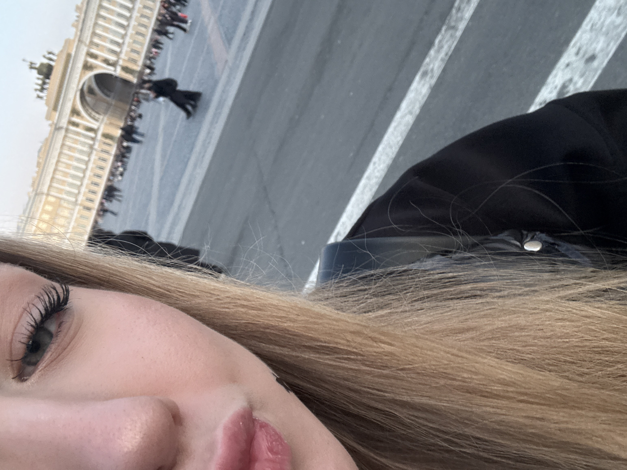 The image captures a partial self-portrait, including the right side of a person's face, light brown hair, and the top portion of a black jacket. The background is a cityscape, featuring the General Staff Building in Saint Petersburg, Russia, with a visible arch and a crowd of people. The pavement indicates a public square with street markings.