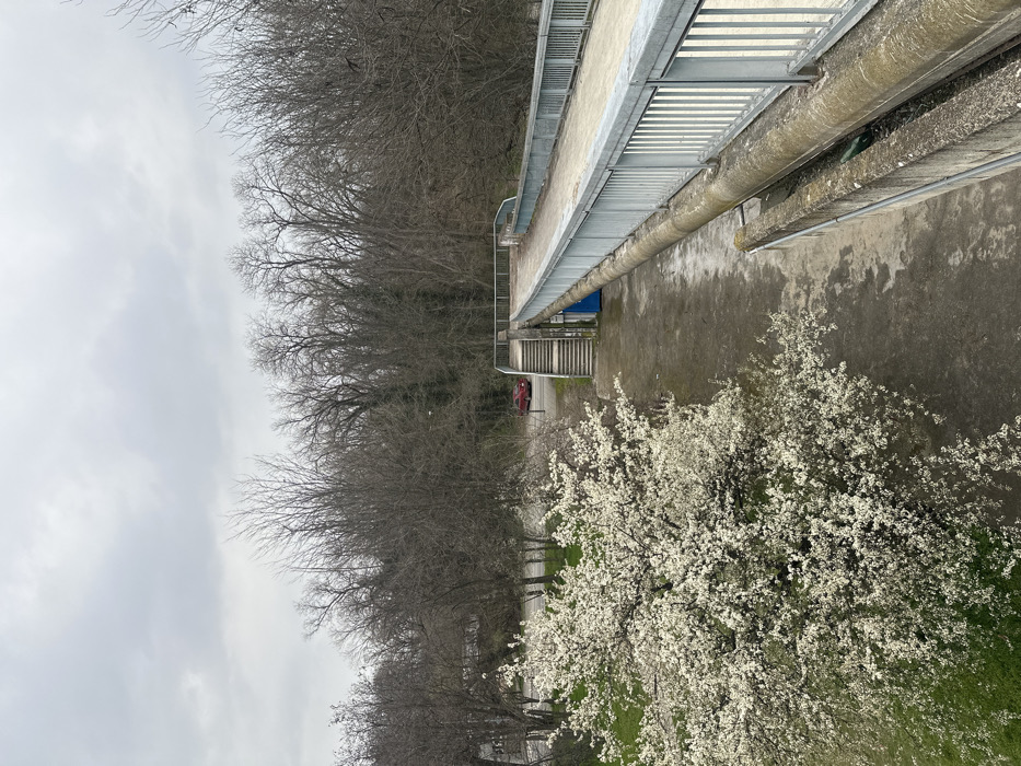 This image depicts an outdoor urban scene in Plovdiv, Bulgaria, observed from an elevated perspective under an overcast sky. A concrete pedestrian overpass, equipped with silver metal railings, extends from the right foreground into the middle distance. A set of concrete stairs provides access to the overpass from ground level, located on the left side of the bridge's base. Below the bridge structure, a large, dark grey concrete pipe or conduit is visible running horizontally. A blue utility box is positioned near the base of the stairs. To the left of the bridge, a large deciduous tree in full white bloom occupies the left midground, with green grass at its base. Behind this flowering tree and to the left of the bridge's stairs, a paved road is visible, upon which a red sedan is stationary. The background is dominated by numerous bare deciduous trees and dense undergrowth, suggesting a late winter or early spring season. The ground beneath the bridge and adjacent to the stairs appears to be a mix of earth and concrete, exhibiting damp patches. No individuals or animals are present in the frame.