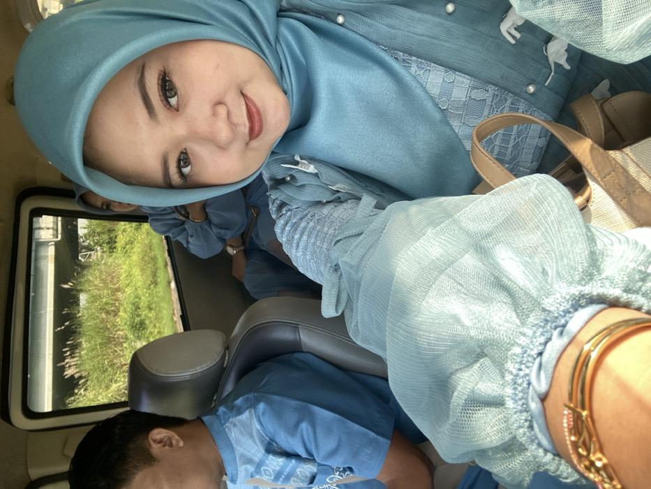This image captures three individuals inside a vehicle, located in the city of Pamotan, Indonesia. The scene is a selfie, taken by a female positioned in the front passenger seat, looking directly at the camera with a faint smile. She is wearing a teal-blue hijab that covers her head and chest, and a light blue dress or top featuring a layered, possibly mesh or lace, outer garment with voluminous, elastic-cuffed sleeves. Small white pearls adorn her attire, along with white floral or leaf-like embellishments. Gold bangles are visible on her left wrist, and she holds a light brown purse with a striped fabric body. To her left, a male figure is partially visible from the right profile, showing his ear and upper torso. He is wearing a light blue shirt, possibly a traditional Indonesian koko shirt, with white patterned embroidery. In the rear passenger seat, behind the male, another female is partially visible, wearing a blue hijab and a matching long-sleeved outfit, with a wristwatch on her left wrist. Through the vehicle's windows, a bright, sunlit outdoor environment is visible, featuring lush green tall grass and vegetation. In the upper background, a section of a large concrete or stone structure, possibly a bridge or overpass, is discernible.