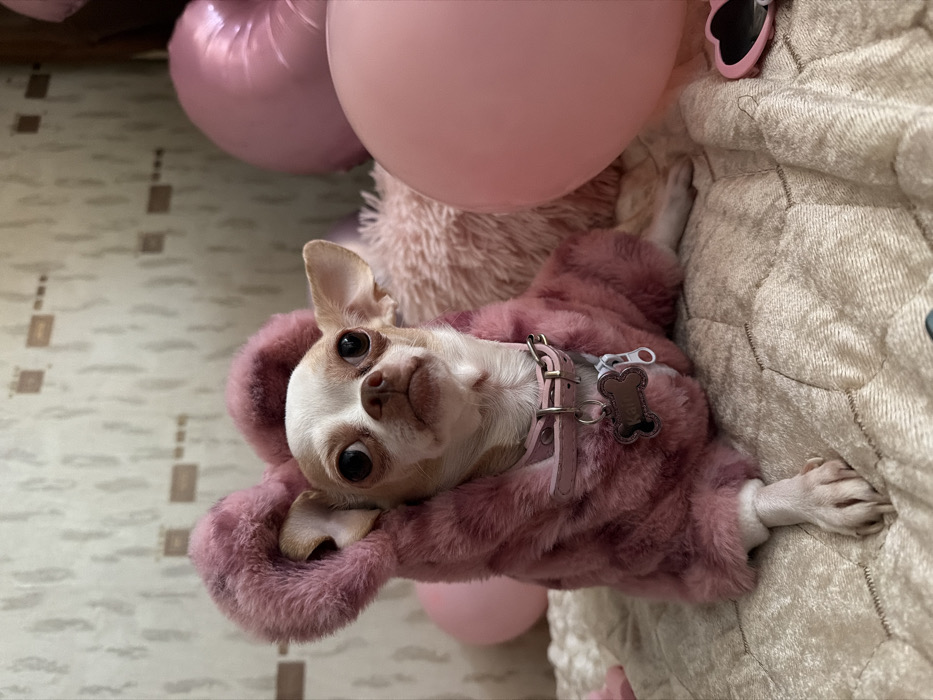An indoor scene features a small chihuahua dog centrally positioned on a light-colored, quilted textile surface. The dog has a white face with tan markings, large dark eyes, and upright ears. It is wearing a pink, hooded, faux-fur garment that covers its body, with two rounded, ear-like structures atop the hood. A pink collar with a metal buckle is visible around its neck, from which hangs a bone-shaped tag with illegible text and a white, zipper-shaped tag. Its front paws are extended onto the quilted surface. The background consists of a wall with a light-colored, subtle rectangular pattern. Several pink balloons are scattered in the mid-ground and background; a large spherical balloon is prominent to the dog's right, and another is partially visible to its left. A section of fluffy pink material, likely a cushion or blanket, is visible behind the dog to its right. In the lower right foreground, a pair of pink, heart-shaped sunglasses with dark lenses rests on the quilted surface. The environment is consistent with a domestic setting. No specific identifying markers are present within the image to determine a location in Yambol, Bulgaria.
