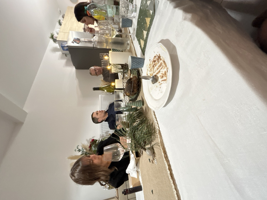 A dinner table is set with a white tablecloth and a burlap runner. Wine glasses, candles, and a centerpiece decorate the table. People are seated along the table, engaging in conversation. One person is wearing a black beanie. An empty plate with chocolate residue and a spoon rests near the center of the table. A bottle of wine sits between two people.