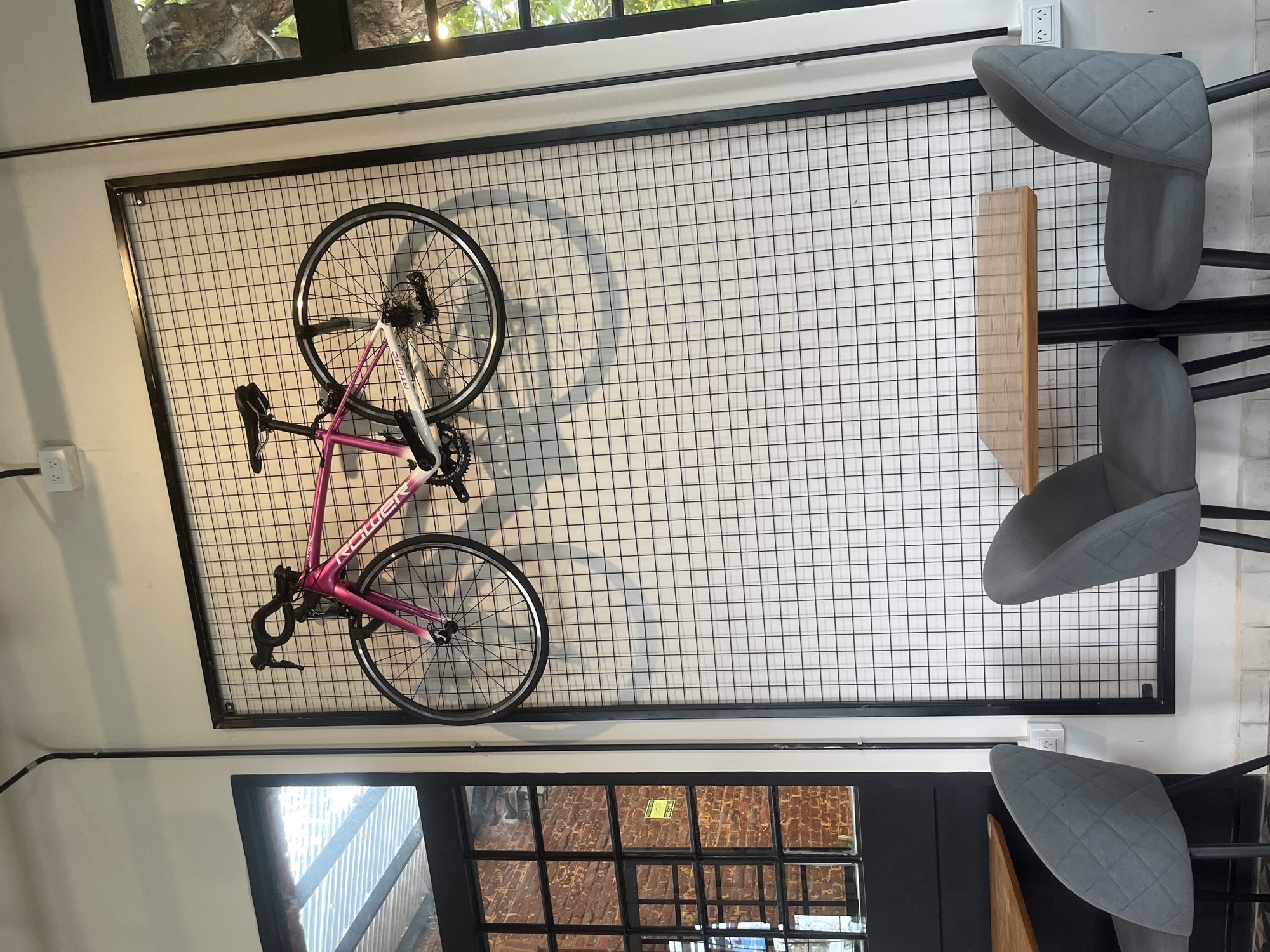 A pink Rowwer bicycle is hanging on a black metal grid wall. The grid is attached to a white wall. To the right, three grey chairs are visible. Below, a black framed window with multiple panes shows a brick wall outside. The scene is presumably indoors. The location is Avellaneda, Argentina, though specific evidence of the location is absent.