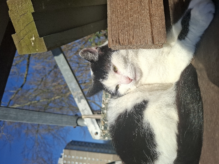 - "A black and white domestic cat rests on a dark brown surface outdoors in Rotterdam, Netherlands" by FM-sRAJo1, licensed under CC BY 4.0