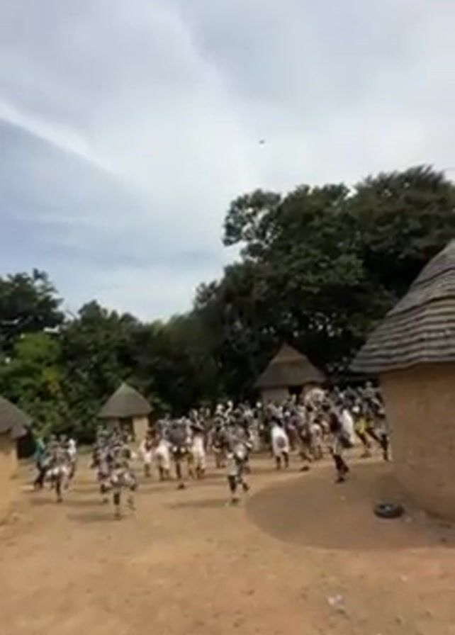 group of people dancing in an outdoor courtyard surrounded by traditional African buildings with thatched roofs. The ground is reddish-brown dirt. The dancers are wearing tribal costumes and there is music playing. Trees are visible in the background, and the sky is partially cloudy. The dancers are moving in a circular formation.