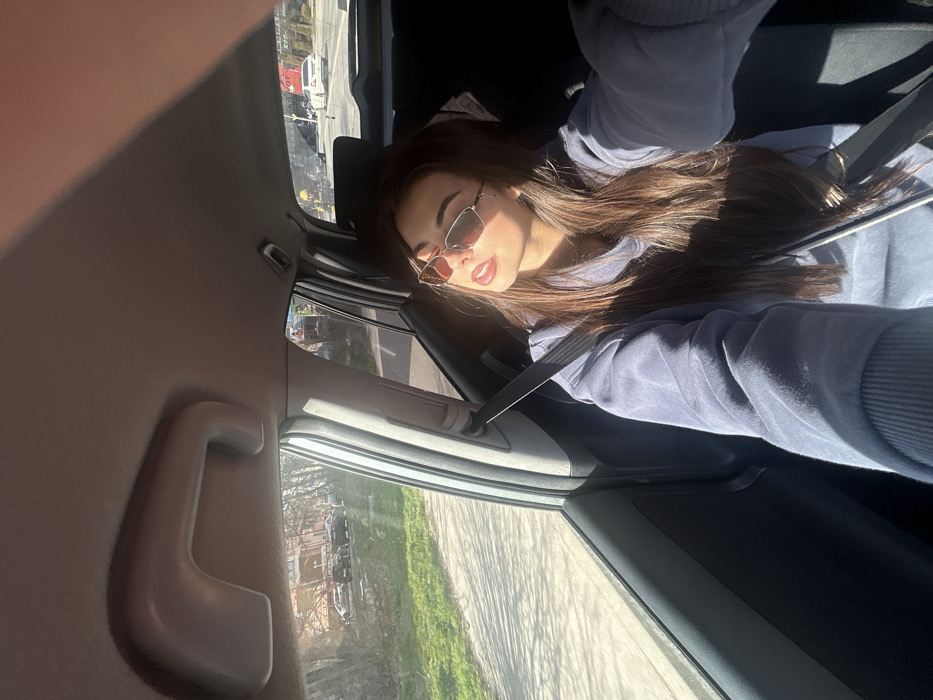 The image depicts the interior of a vehicle from the perspective of the front passenger seat, looking forward and towards the passenger side. A young female subject occupies the front passenger seat, facing slightly towards the camera. She has long, dark brown hair, wears rectangular, reddish-tinted sunglasses, and bright red lipstick. She is dressed in a blue or gray hooded sweatshirt and has a black seatbelt secured diagonally across her chest. Her left arm is extended towards the camera, suggesting she is holding the camera device. Strong, low-angle sunlight enters through the passenger side window, illuminating the subject's face and casting shadows within the vehicle's gray interior, which includes a ceiling grab handle and a visible B-pillar. Through the vehicle's windows, an urban exterior environment is visible. Through the passenger side window, green ground cover, bare-branched trees, and multi-story buildings with various facades (one appearing reddish-orange) are seen, with several parked cars in the background. Through the front and driver's side windows, a multi-lane paved road with traffic is visible, including a distant white car. In the far background, a large red commercial sign with white lettering is partially discernible; the visible fragments of text are consistent with parts of "Vitosha." The scene is an urban street in Sofia, Bulgaria, likely in proximity to Vitosha Boulevard, suggested by the distant commercial signage. The weather appears clear and sunny.