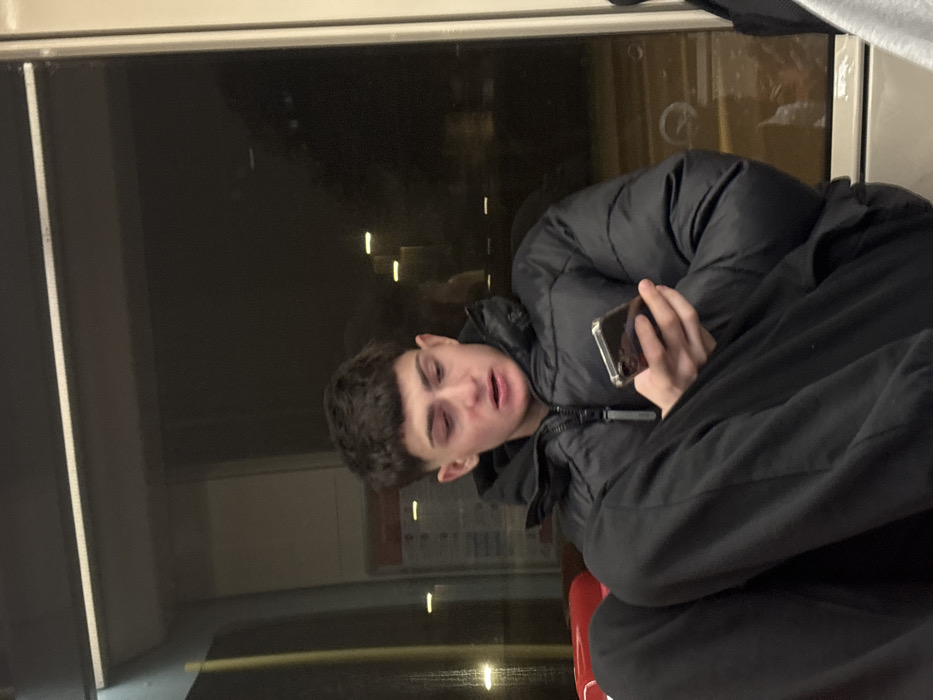 A young man with dark hair and a black puffy jacket sits, likely on a train, with his face turned toward the camera