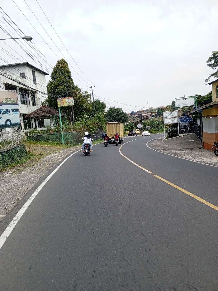 This image depicts an outdoor daytime scene on a curving asphalt road. The provided information identifies the location as the city of Multhan, India. The sky is overcast. The road features a solid white line on its left edge and a solid yellow line separating lanes. On the left side of the road, a dirt shoulder abuts a green retaining wall. Beyond the wall, a white multi-story building with dark windows and a flat roof is visible. In front of this building, a large billboard displays a white passenger van and the text "LUXURY JOURNEY." Adjacent to the billboard is a smaller building with a dark brown tiled roof. Further left, a green sign with a red logo (likely "SG") is erected amidst dense green vegetation. Utility poles and overhead power lines are present throughout the left side. On the right side of the road, a light-colored building with yellow walls and a brown roof overhang is partially visible in the foreground. Further down the road, a large green billboard displays text, including what appears to be "RAJAWALI PARIWISATA" and "RENT A CAR." Below this, a stack of white rectangular signs provides additional information. More residential structures are visible on the distant hillsides, integrated with lush green trees and bushes. Multiple vehicles are traveling away from the viewer along the road. In the foreground, a person wearing a white helmet and a patterned shirt rides a black scooter. Ahead of this scooter, two additional scooters are in motion. Following the scooters is a light-colored box truck with a brown container unit, trailed by a dark sedan. Further in the distance, a white car and a yellow vehicle are visible, navigating the curve of the road. All observable people are operating their respective vehicles.