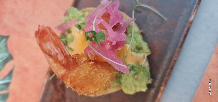 - "A close-up, vertical shot captures a single deep-fried shrimp standing upright on a round, flat base, possibly a mini tostada or cracker" by FM-PD02y1, licensed under CC BY 4.0