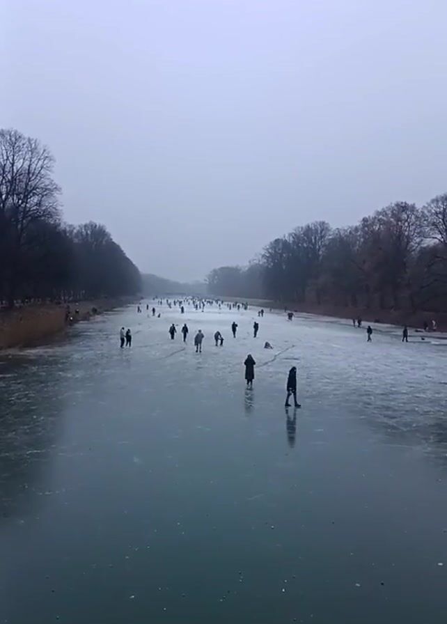 frozen river or canal with many people walking or skating on the ice