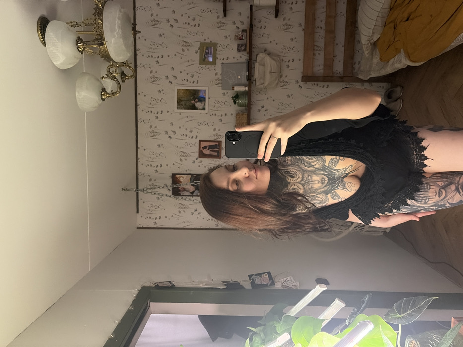 A woman takes a selfie in a mirror. She has auburn hair and is wearing a low-cut black top, revealing extensive tattoos on her chest and arms. The background includes patterned wallpaper, framed photos, a shelf, and a bed. Below the mirror is a window with plants and lights. An ornate chandelier is visible at the top of the mirror. The photo is taken at an angle, causing a slight distortion.