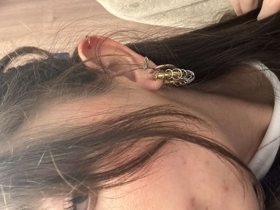 A close-up shot shows a person's ear, extensively decorated with piercings