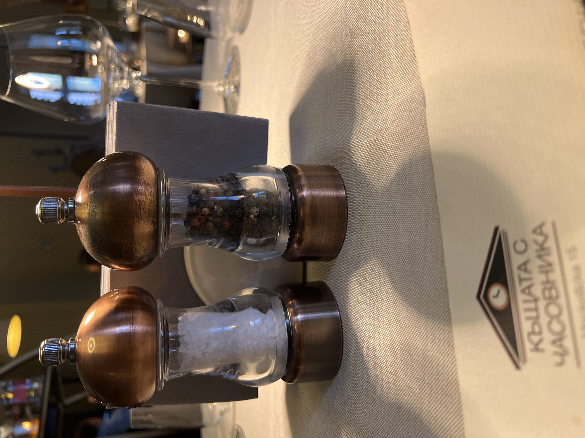 The scene is an interior view of a dining table at "Къщата с часовника" (The House with the Clock) restaurant, located at 15 Malko Tarnovo Street, Sofia Center, Sofia, Bulgaria. Centrally positioned on a light-colored, textured tablecloth are two matching tabletop grinders. The grinder on the left has a clear glass body containing coarse white salt and features brushed copper-toned metallic caps and bases. The grinder on the right, also with a clear glass body, contains a mixture of whole peppercorns and has identical brushed copper-toned metallic components. Immediately behind these grinders, a stack of grey folded napkins is visible. To the right, a stemmed wine glass is present, out of focus, reflecting interior light sources. A portion of a white menu card in the bottom foreground displays the restaurant's logo—a stylized house roof with a clock—and its name "КЪЩАТА С ЧАСОВНИКА" in Cyrillic, with the address "Малко Търново 15" partially visible. The background is blurred, showing warm, subdued artificial lighting, including a distinct golden light fixture at the top center and faint outlines of other patrons or decor, with a person in a blue garment indistinctly visible on the far left. No direct interactions are depicted; the objects are static.