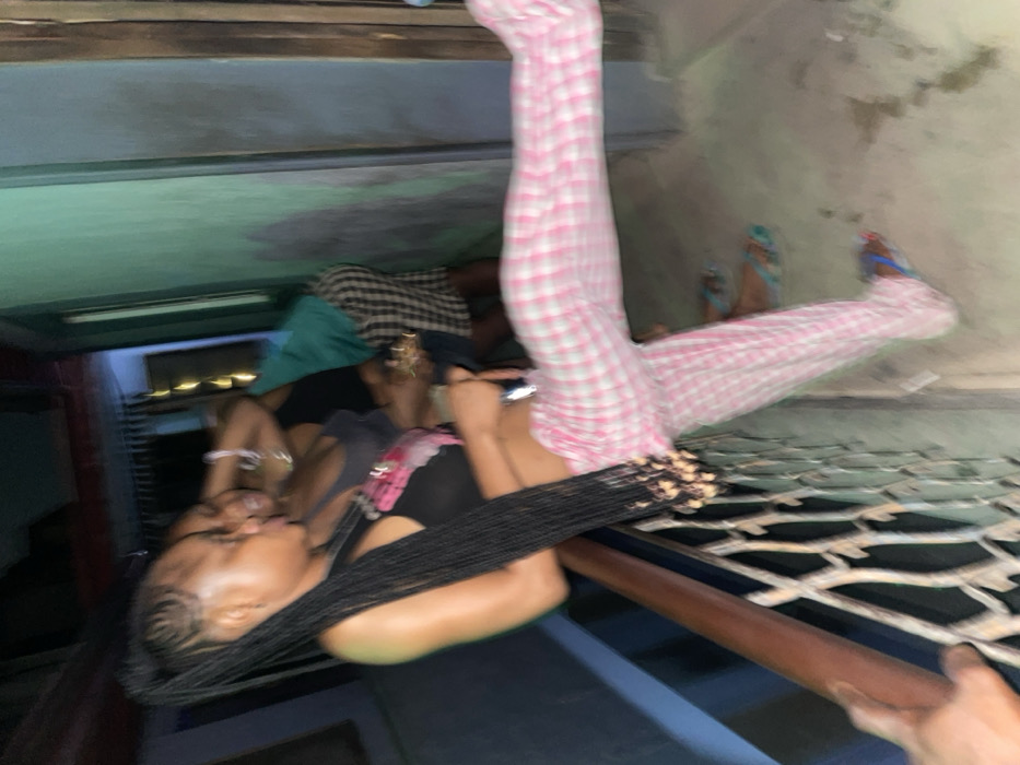 A blurry, tilted shot depicts an interior setting with a young woman wearing pink checkered pants. She is reclining or sitting with her legs raised in the air. Other individuals are visible in the background, appearing to be lying down or resting. The scene is somewhat chaotic, with movement contributing to the blur. The lighting is dim, and the surroundings appear to be a communal or shared living space. A patterned rail or barrier is in the foreground.