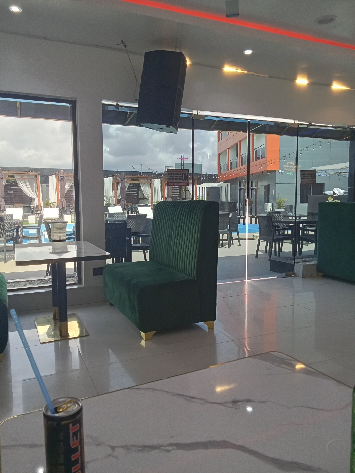 The interior of a restaurant located at the coordinates (latitude: 5.472, longitude: 5.817) in Ujevwu, Nigeria, is shown. There is a green sofa with gold legs in the foreground, along with a small table with gold legs, and a beverage can on the table. The window behind the table looks out into the courtyard of a hotel, which features a swimming pool and patio furniture. The restaurant is brightly lit, with a speaker hanging from the ceiling and a red light strip running along the ceiling. The walls are white, and the floor is tiled. There are two windows in the room, looking out on a courtyard with a pool. There is outdoor furniture in the courtyard. There is a second, dark green sofa in the background. There are no people present. The scene suggests a restaurant that is likely open to the public and is intended for casual dining. The image appears to have been taken during the day, as the sun is shining outside. There is a slight glare on the floor in the center of the image.