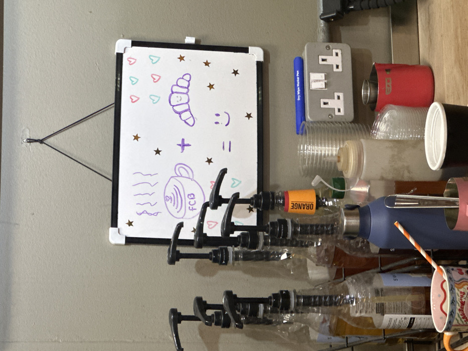 The image displays a close-up of a service counter area, likely within a café or coffee shop, against a neutral beige wall and a light wooden countertop. No individuals are visible. A small white dry-erase board, framed in black and white, is centrally hung on the wall by a black string loop from a single hook. The board features purple marker drawings: a steaming coffee cup with a heart design in the foam and "FCB" written below, a plus sign, a smiling croissant, an equals sign, and a smiley face. Small brown star-shaped decorations are scattered across the board, along with light pink and light blue heart drawings on the right side. Below and to the right of the whiteboard, a grey electrical outlet plate with two standard UK three-pin sockets and white switches is mounted on the wall. A blue "Dry Wipe Marker Pen" rests horizontally on top of this outlet plate. On the counter, positioned beneath the whiteboard and outlet, are various items. A row of clear plastic bottles, many fitted with black pump dispensers, are present, indicative of beverage syrups. One bottle has a prominent orange label marked "ORANGE"; other partial labels suggest "SWEET." A dark blue insulated bottle stands among these. A clear squeeze bottle and a stack of clear plastic cups are also visible. In the foreground, a patterned pink ceramic mug with an orange handle contains an orange and white striped straw. Next to it, a metallic pink holder contains a silver stirring utensil. Further to the right, a small red metallic pitcher holds a smaller silver measuring cup. A black paper coffee cup with a white lid is positioned towards the bottom right. The electrical outlets confirm the location as the United Kingdom. Precise identification of an establishment within Tonbridge and Malling is not possible based solely on the visual information provided.