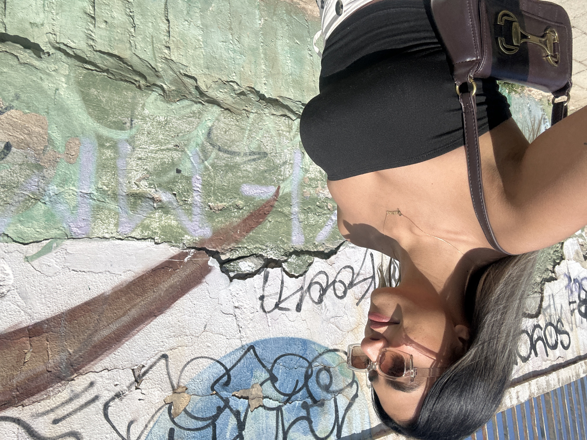 A young woman is depicted in a waist-up, outdoor shot, standing to the left of a heavily graffitied wall under bright sunlight. She has long, dark hair with lighter ends and wears square-framed, translucent brown sunglasses, a black strapless tube top, and a gold necklace with a "queen" pendant. A dark brown shoulder bag with a gold equestrian-style buckle hangs from her right shoulder. Her head is turned slightly to the right, and she exhibits a subtle smile. The background is a weathered concrete wall displaying multiple layers of graffiti in black, blue, green, and brown, including legible tags like "SOYO" and "Koon." The wall shows significant cracking, peeling paint, and exposed plaster, indicating deterioration. The scene is located in a street environment in the city of Alicante, Spain.