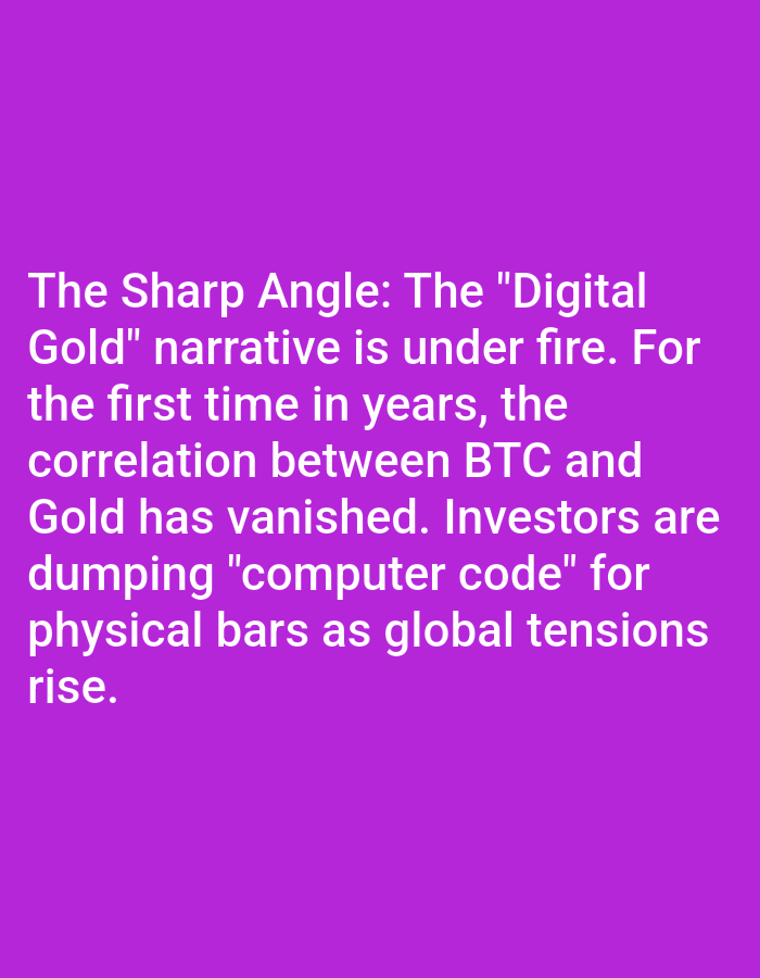 A vibrant purple background showcases white text proclaiming "The Sharp Angle." The text highlights that the "Digital Gold" narrative is being questioned. It indicates that the correlation between Bitcoin (BTC) and gold has disappeared for the first time in years. The reason given is that investors are selling "computer code" and acquiring physical gold bars due to rising global tensions.