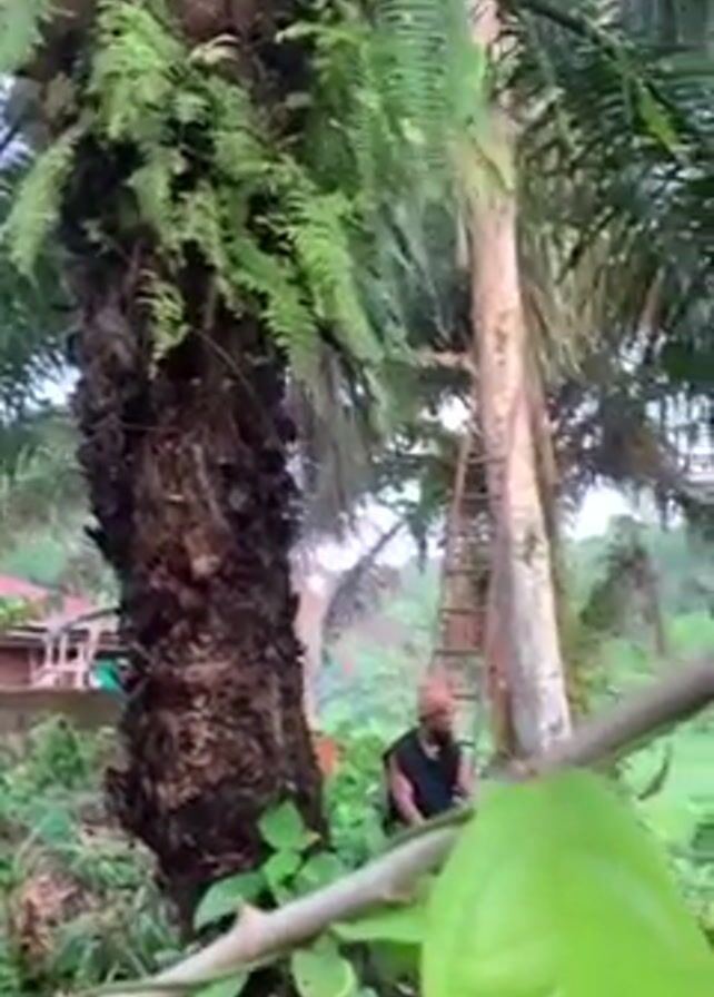 The scene is set in a lush, green environment, likely a tropical or subtropical area, judging by the dense vegetation and palm trees. The focus is on a man sitting at the base of a tall, light-colored tree. The tree has a ladder propped against it. The man is wearing a dark sleeveless top and shorts, along with a head covering, and he appears to be looking towards the camera. He’s in a seated position on the ground. To the left of the light tree is a darker, shorter palm tree with ferns growing on its trunk. The foreground features a branch with green leaves. The overall impression is that of a rural setting with the man possibly engaged in some sort of activity related to the tall tree, although the exact nature of the activity is not clear. A building is partially visible in the background. The lighting suggests it might be early morning or a cloudy day.