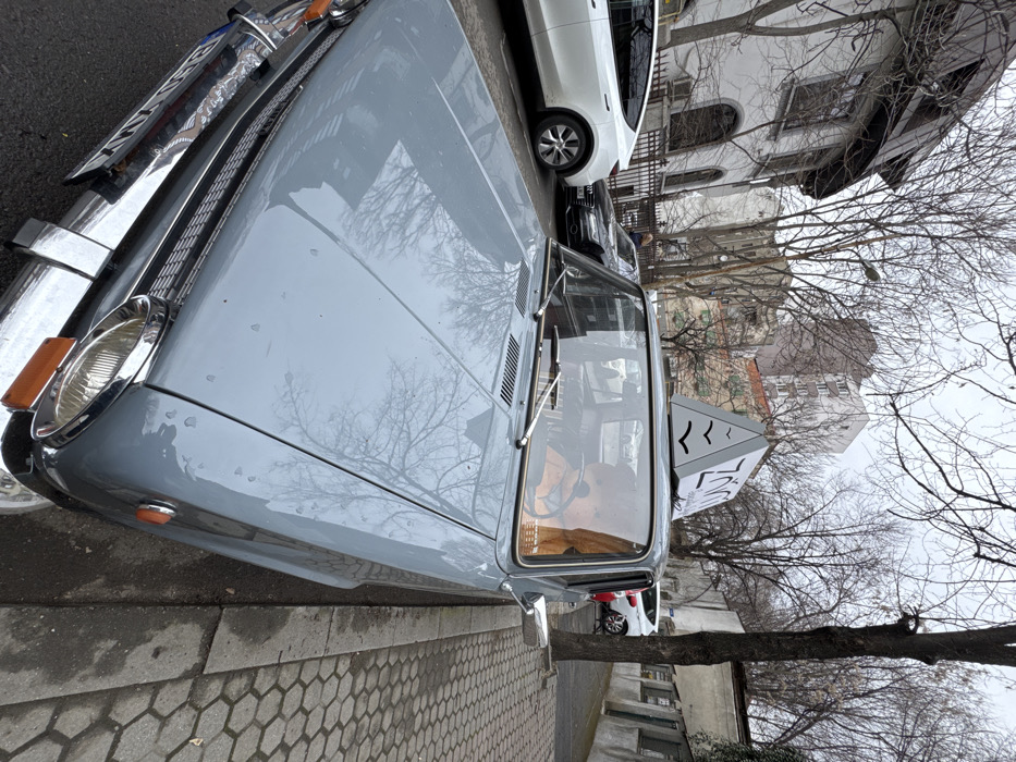 A light blue/grey vintage sedan, likely a Lada VAZ-2101 or similar model, is parked curbside on a paved street in Bucharest, Romania