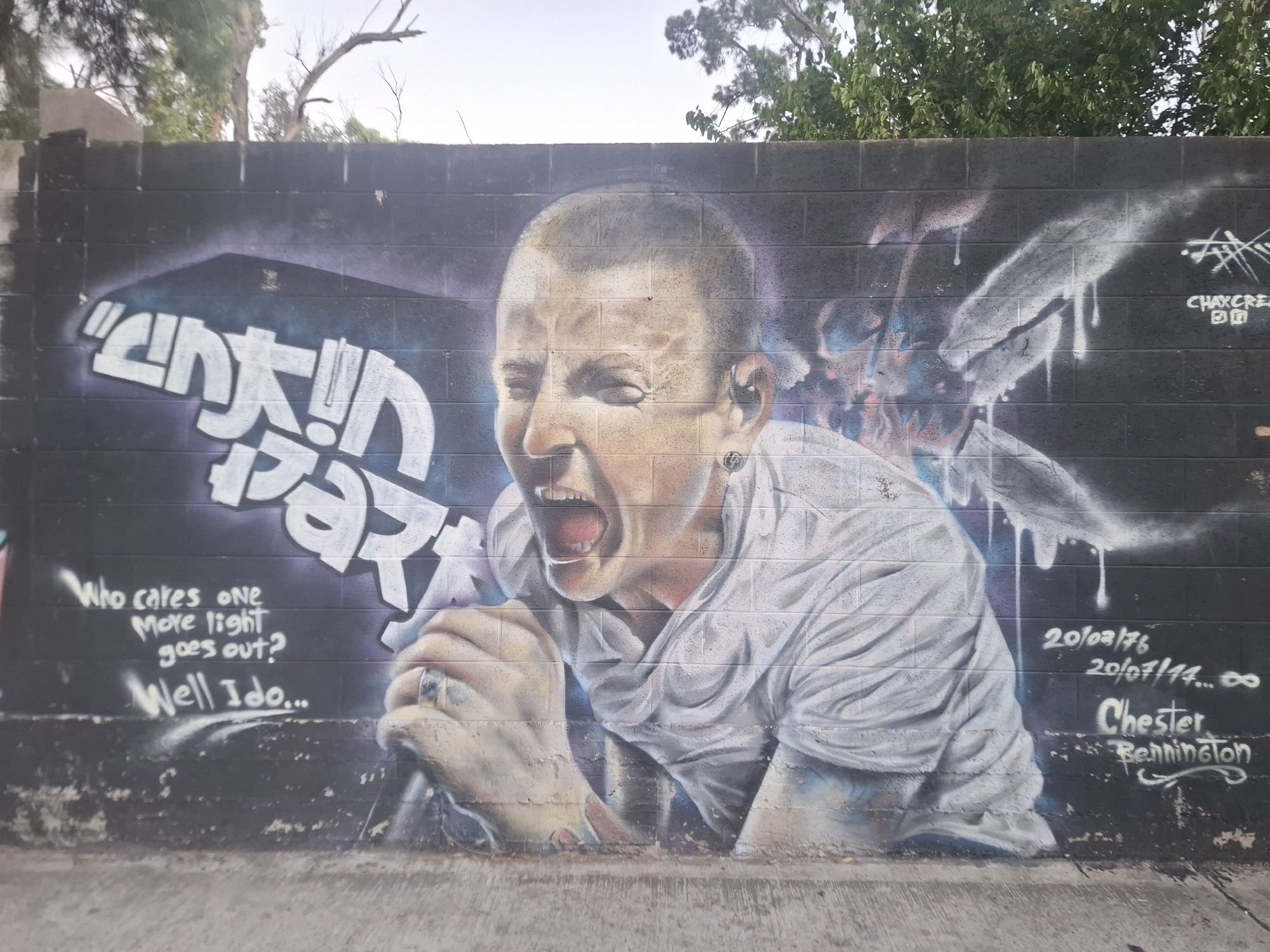 The image displays an outdoor graffiti mural on a dark grey brick wall in Villa Domínico, Argentina. The central subject is a realistic portrait of Chester Bennington, depicted from the chest up, with a shaved head, open mouth in a scream, and wearing a white, wrinkled shirt. An earlobe piercing is visible in his left ear. His hands are depicted clenched in front of him. To the upper left, "LINKIN PARK" is stenciled in white block letters with purple and blue outlines. Below this, on the left side, white text reads: "Who cares one More light goes out? Well I do...". To the lower right of the figure, white text indicates dates "20/03/76" and "20/07/17... ∞", followed by "Chester Bennington". In the upper right corner, a white tag "CHAXCREA" is present with abstract symbols. The mural incorporates white, blue, and purple spray paint effects around the figure. The wall's base transitions into a concrete ground surface. Above the wall, green tree foliage and bare branches are visible against a light sky, indicating an outdoor location.
