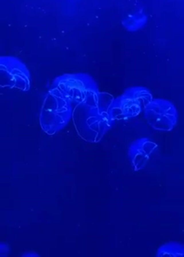 several jellyfish swimming in a blue-lit tank. They are translucent with a blue glow. The background is a deep blue. There is faint chatter in the background.