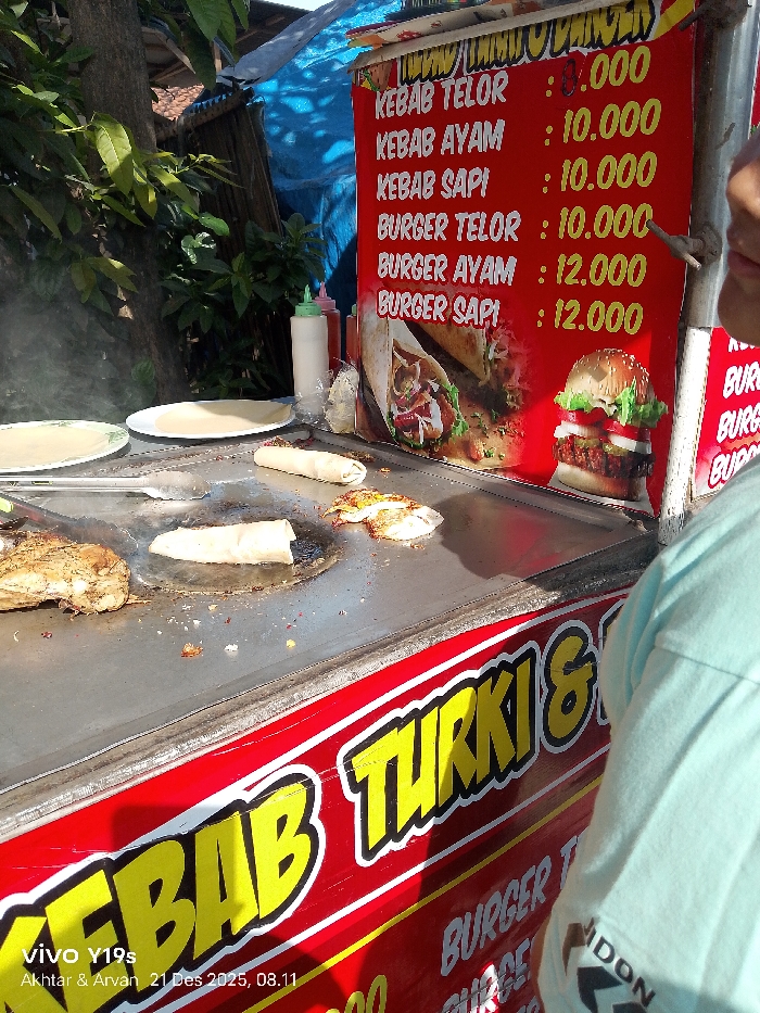 A food cart selling kebab and burgers is pictured. A red sign displays the menu with prices: Kebab Telor (8,000), Kebab Ayam and Sapi (10,000 each), and Burger Telor (10,000), Burger Ayam and Sapi (12,000 each). Food is being cooked on a flat top grill. Sauces and condiments are on the side. "KEBAB TURKI" is prominently displayed on the cart. A logo for "vivo Y19s" and the date "21 Des 2025, 08.11" are visible in the corner.