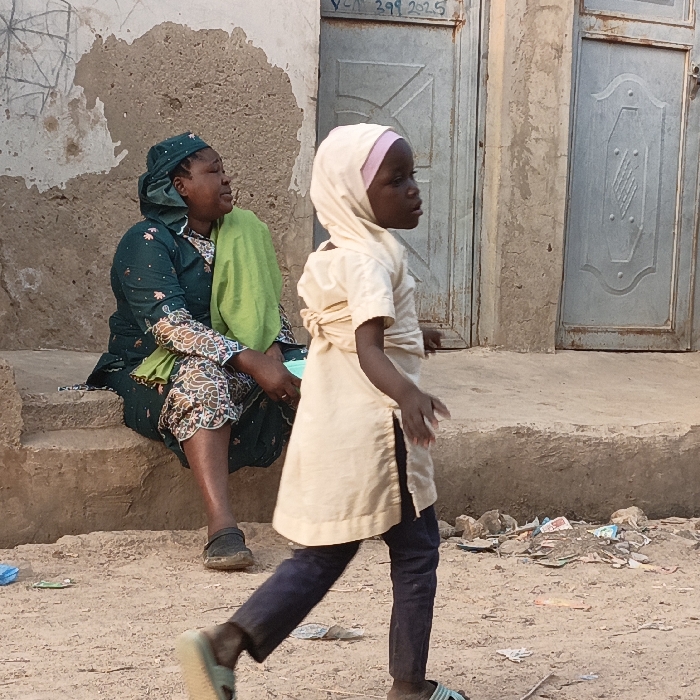 A young child in a white headscarf and tan outfit walks across a dirt path in front of a building. An older woman sits on a concrete step, wearing a green patterned dress and headscarf, with a green scarf draped over her. Trash litters the ground near a doorway with a faded sign above it. The scene captures a moment of everyday life in a possibly rural or impoverished area.