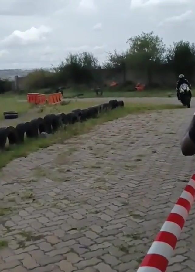 A person on a black motorcycle, number 72, races towards the camera on a brick road surrounded by tires. Another person stands to the side, recording the motorcycle on a phone. There are trees and an overcast sky in the background. The area is separated by red and white striped posts.