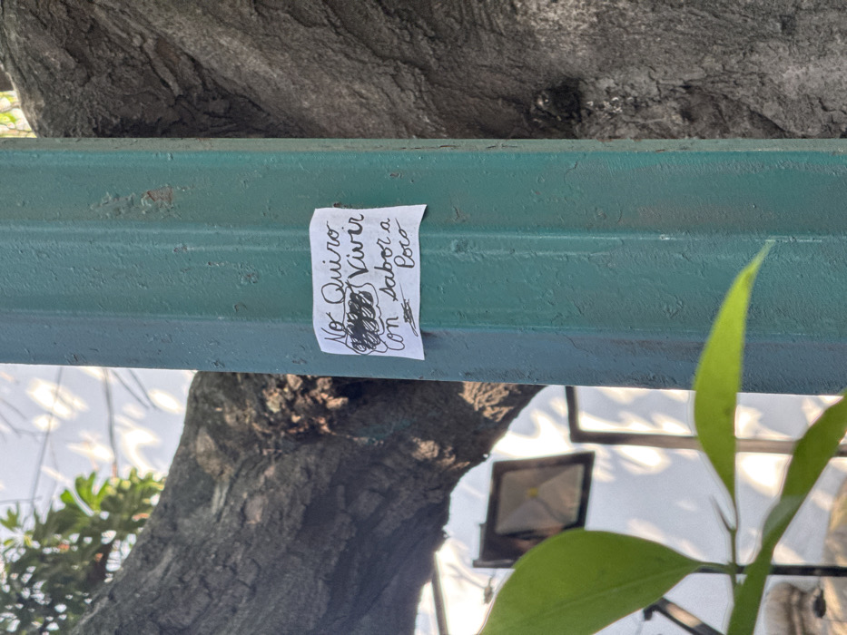 A small, white, rectangular piece of paper with handwritten text is adhered to a green, metal beam. The writing is in a dark color and appears to be in Spanish. The phrase "No Quiero vivir con sabor a poco" is visible, though partially obscured by dark scribbles or ink. The beam is set against a backdrop of a tree trunk and branches, along with a glimpse of what appears to be a white building or structure. Green leaves are also visible on the right side of the frame.