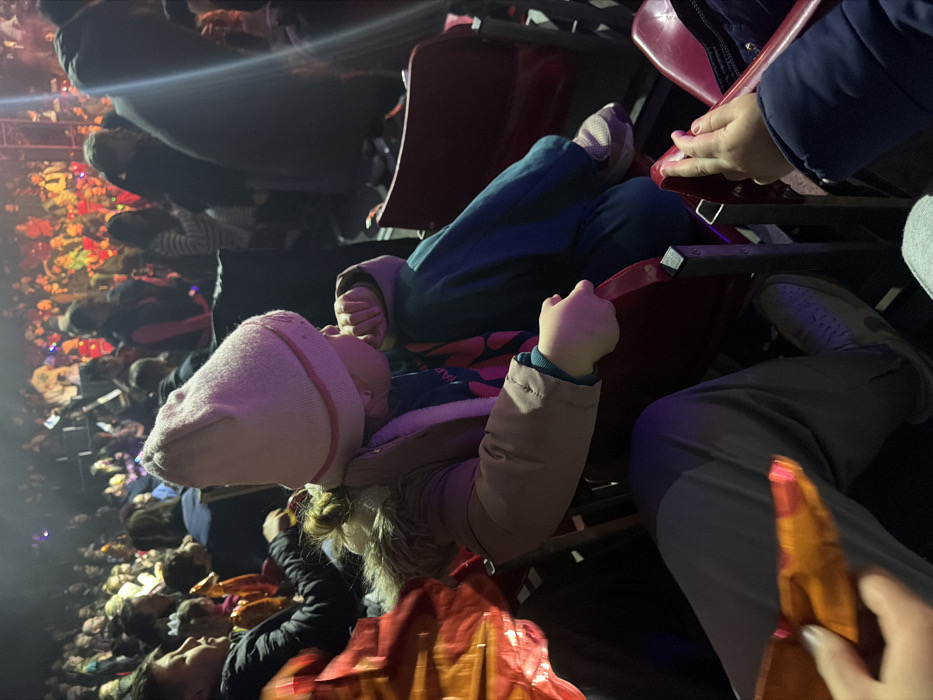 The image depicts an indoor entertainment event in Bretton, United Kingdom, from an audience perspective. A young child is centrally seated in a red folding chair with a black metal frame. The child wears a light pink knitted beanie hat, a tan winter coat with a faux fur-lined hood, dark trousers, and light-colored sneakers. Their left hand is positioned near their mouth, and the right hand rests on the seat's armrest. To the child's immediate left, a partially visible individual in a dark jacket holds a bright orange, reflective object. In the direct foreground, a person's legs in grey trousers are visible, holding an orange wrapper. The background reveals a large, densely packed audience in rows of similar red seating, illuminated by dynamic, colored stage lighting predominantly featuring red and orange hues. Several distant audience members are visible holding glowing objects. The overall scene is dimly lit.