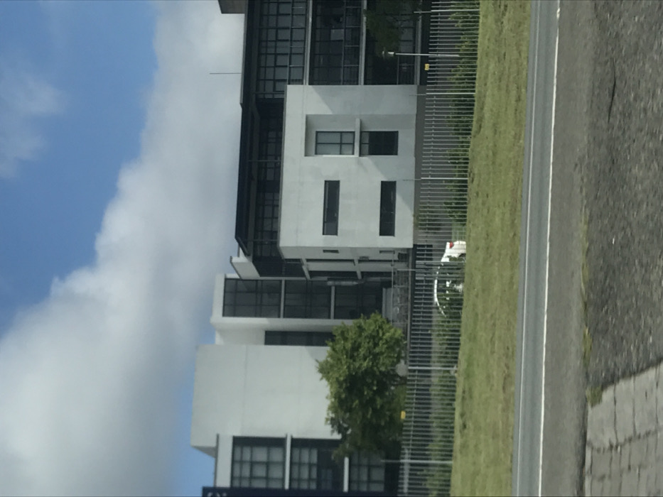 A modern, white building with dark windows stands adjacent to a green lawn and a gray road. A wire fence separates the lawn from the building. The sky is blue with fluffy white clouds. A small green tree is partially visible. A white car is parked behind the fence. The building has a boxy, geometric design with multiple levels.