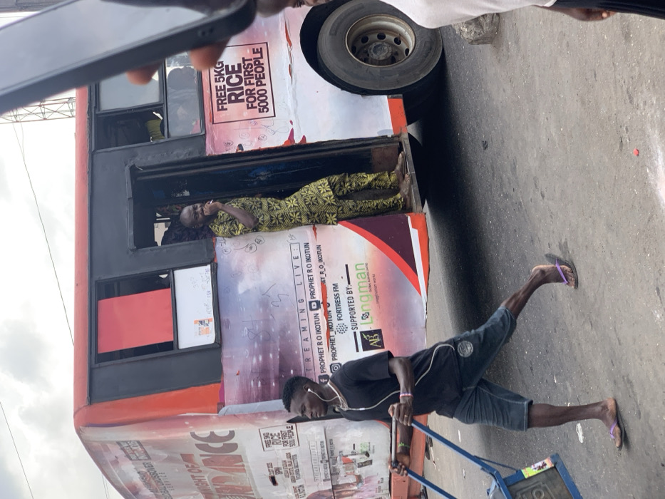 The image depicts a bustling street scene in Lagos, Nigeria, likely a major thoroughfare or bus stop area. In the center, a large, worn commercial bus, painted orange and white, is either parked or moving slowly. The bus's side features multiple advertisements, including "NIGHT OF ABUNDANCE," "FREE 5KG RICE FOR FIRST 5000 PEOPLE," and promotional material for "PROPHET R.O. IKOTUN" with social media handles and "SUPPORTED BY: FORTRESS FM" and "Longman Global & Advertising." A man, dressed in a yellow and black patterned traditional outfit, stands barefoot in the open side door of the bus, with his right hand near his mouth, possibly holding a small object. He looks towards the left. In the foreground to the left, a young man walks purposefully towards the left, pushing a blue, two-wheeled handcart. He wears a black t-shirt, dark shorts, purple flip-flops, earphones in his ears, and a light-colored wristband on his right wrist. To the immediate right in the foreground, only the shoulder and arm of an individual are visible, holding a black smartphone angled upwards, appearing to capture the scene. The road surface is grey asphalt with some debris, and an overcast sky is visible above. Power lines and a metal mast structure are present in the background.