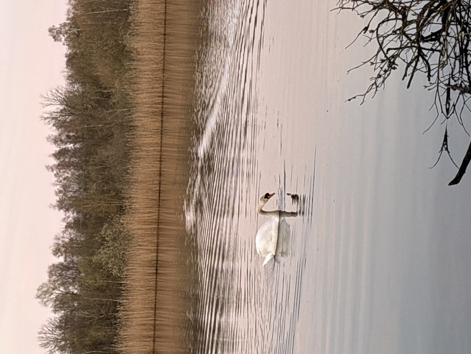 This image displays a body of water in Niel, Belgium, illuminated by a pale pinkish-orange sky. A single white swan with an orange beak is situated in the mid-left portion of the water, its head dipped downwards, creating distinct ripple patterns that extend across the surface, particularly towards the upper right. A partial reflection of the swan is visible below its head. The far bank is characterized by a dense, horizontal band of tall, dry, brown reeds. Behind these reeds, a line of deciduous trees, primarily bare of foliage with some sparse green growth, is visible. In the lower-right foreground, dark, bare tree branches extend into the water. No human subjects or their direct interactions are present.