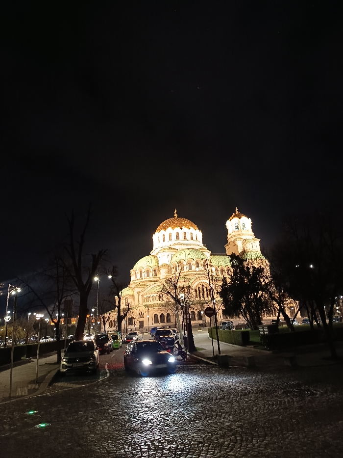 The image displays a night scene featuring the Alexander Nevsky Cathedral in Sofia, Bulgaria, illuminated by artificial lighting