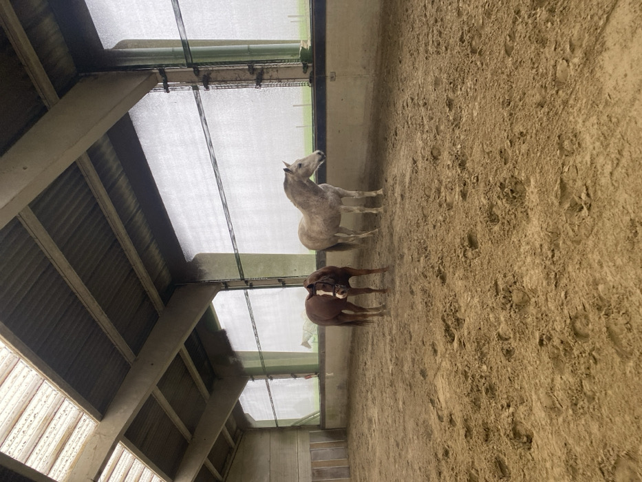 An interior view of a riding arena in Mouscron, Belgium, depicts two horses standing on a sandy, light brown ground marked with numerous hoof prints