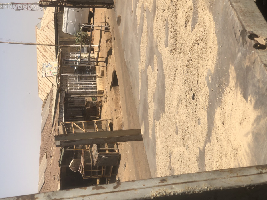The image depicts an outdoor street scene in Tukur Tukur, Nigeria, under clear, bright daylight. In the immediate foreground, a flat, grey surface, likely concrete or a vehicle bed, is partially covered with scattered light brown granular material. A rusty, vertical metal beam partially frames the left side of the shot. Directly behind this, a dirt road with visible ruts and a concrete drainage ditch runs horizontally. On the left side of the road, a single-story building with a rusted corrugated metal roof features multiple large, unfinished wooden cage-like structures or display racks in front. Several solar panels are installed on its roof. A sign above its entrance, partially obscured, reads "TECHNICAL TECHNOLOGY." To the right of this, another single-story building with a similarly rusted corrugated metal roof features a white, barred security gate at its entrance. A prominent sign above this structure reads "BINT & SONS PROVISION STORE." Further to the right, a white or light grey van is parked near another building. A tall, red and white metal telecommunication tower is visible in the far upper right background. No individuals are clearly discernible or engaged in specific actions. The environment appears dry and dusty.
