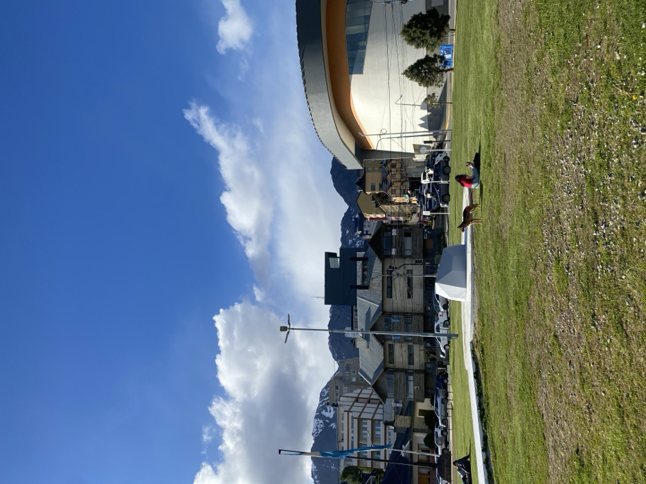 A serene town nestled against snow-capped mountains is bathed in sunlight under a blue sky dotted with fluffy clouds. A modern building with a curved facade rises above the scene. A lush green lawn stretches out, where a person and a dog enjoy the day. Buildings of varying heights, mostly with gray roofs, line the streets, with parked cars adding to the urban landscape. Utility poles and flags punctuate the skyline, emphasizing the town's infrastructure.