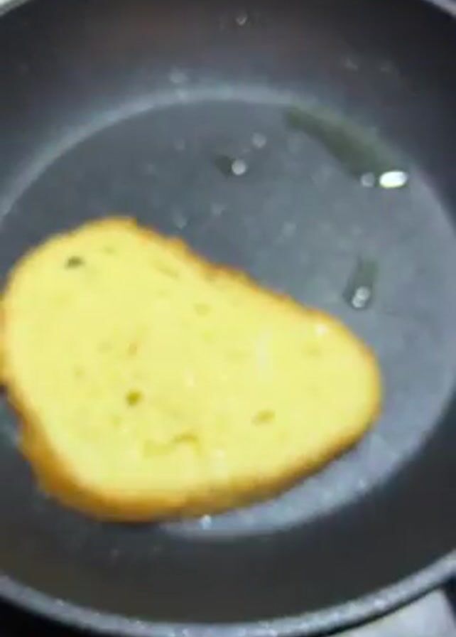 A close-up shot shows a slice of egg bread being placed in a black frying pan with oil on a black induction cooktop. Then, another slice of bread is added next to the first.