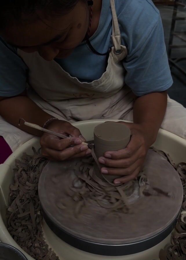 A woman wearing a blue shirt and a light-colored apron sits at a pottery wheel. She is using a small tool in her right hand to cut or shape a cylindrical piece of clay on the rotating wheel. Her left hand is supporting the clay. The wheel is surrounded by damp clay scraps. There is a container with water to the left of the wheel. The scene appears to be indoors, possibly in a studio or workshop setting.