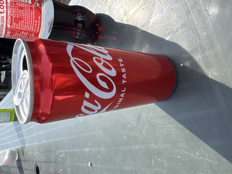 The scene depicts an outdoor or brightly lit indoor setting in Dolni Bogrov, Bulgaria. A red Coca-Cola brand aluminum can, open with its pull-tab bent backward, stands prominently on a grey, scratched tabletop. The can displays "Coca-Cola ORIGINAL TASTE" in white lettering. To the right and slightly behind the can, a partially visible clear plastic bottle containing dark liquid, identified as another Coca-Cola product, is present. Its label exhibits Cyrillic text, including "Coca-Cola", "500 ml", and a numerical price of "1,00". To the left and rear of the can, a small, clear container filled with white granular material, consistent with salt, is visible. The grey table surface shows multiple linear abrasions and scattered light-colored specks. Direct sunlight illuminates the scene from the upper left, casting distinct shadows of both the can and the bottle towards the lower right. No identifiable individuals are directly visible; however, reflections on the can and bottle surfaces suggest the presence of at least one human figure in the immediate vicinity, possibly holding the device used to capture the image.
