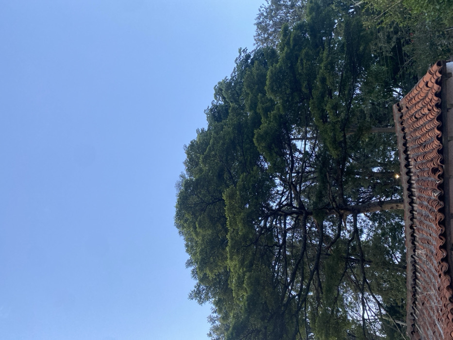 The image displays an outdoor scene under a clear, pale blue sky, which occupies the upper third of the frame. The middle and upper-middle sections are dominated by the dense, dark green canopy of a large, mature tree with visible, gnarled dark branches. Additional lighter green foliage from other trees is present in the background, suggesting a heavily vegetated environment. The lower third of the image features the roofline of a structure, covered with terracotta-colored, S-shaped or mission-style clay tiles arranged in overlapping rows. The tiles show signs of weathering. The scene is illuminated by natural daylight. The location is Nairobi, Kenya. No people, animals, or specific activities are discernible.