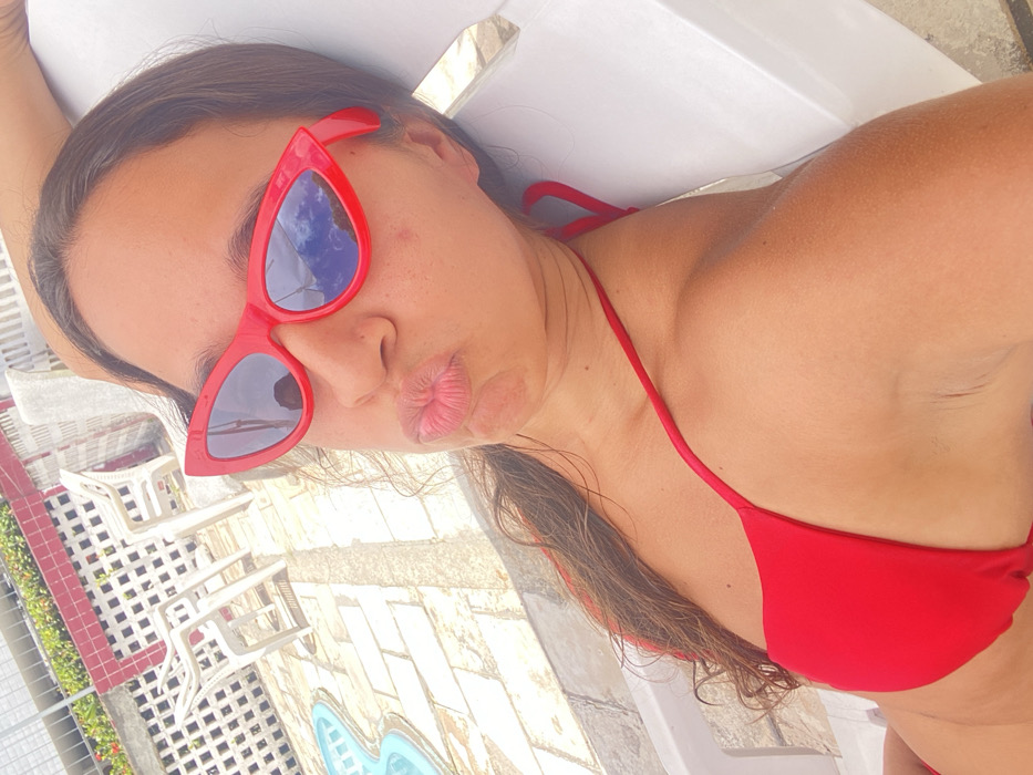 A female subject is captured in a close-up selfie, positioned in an outdoor poolside environment in Recife, Brazil, during daytime. The subject, with dark hair partially visible, is wearing red cat-eye sunglasses featuring blue reflective lenses and a red bikini top with thin straps. Her lips are pursed in a "duck face" expression. She is reclined on a white plastic lounge chair, partially visible on the right. The background features a paved area with light-colored rectangular tiles, leading to a partial view of a light blue swimming pool with an ornate edge on the left. In the mid-ground, two white plastic chairs and a small white plastic table are visible. A white lattice-patterned wall with a red top border separates this area from a higher level, where green foliage and a building's white railing are discernable. The sky, reflected in the sunglasses, indicates clear conditions with white clouds.