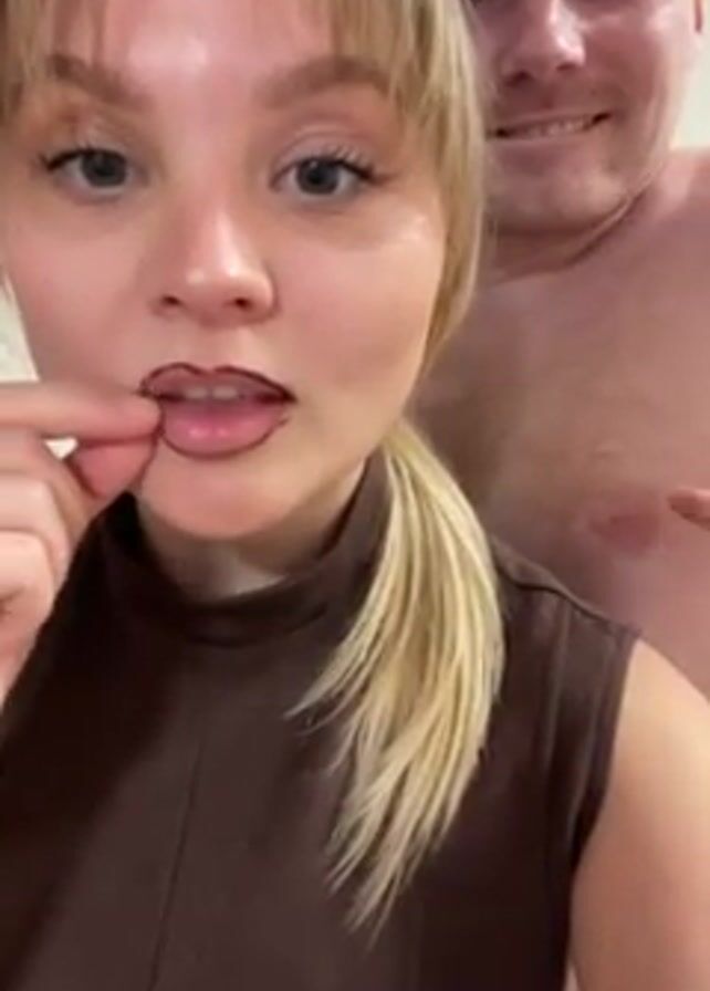 A woman with blonde hair in a ponytail and a brown shirt is holding a piece of floss and cleaning between her teeth. She has a brown lip liner drawn on her lips. Behind her, out of focus, is a shirtless man with red hair smiling.